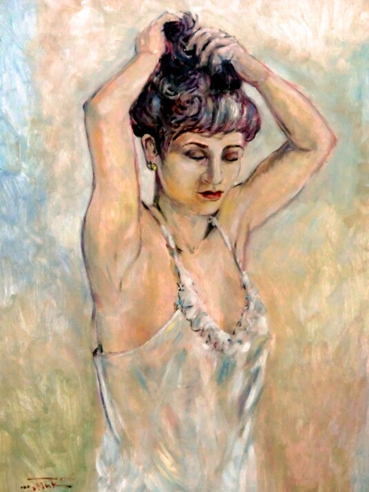 In leichter Draufsicht ist das Bildnis der Frau kubistisch verfremdet. Das schulterfreie weinrote Kleid gibt den Blick auf ein üppiges Dekolleté frei, welches von einer Kette geziert wird.